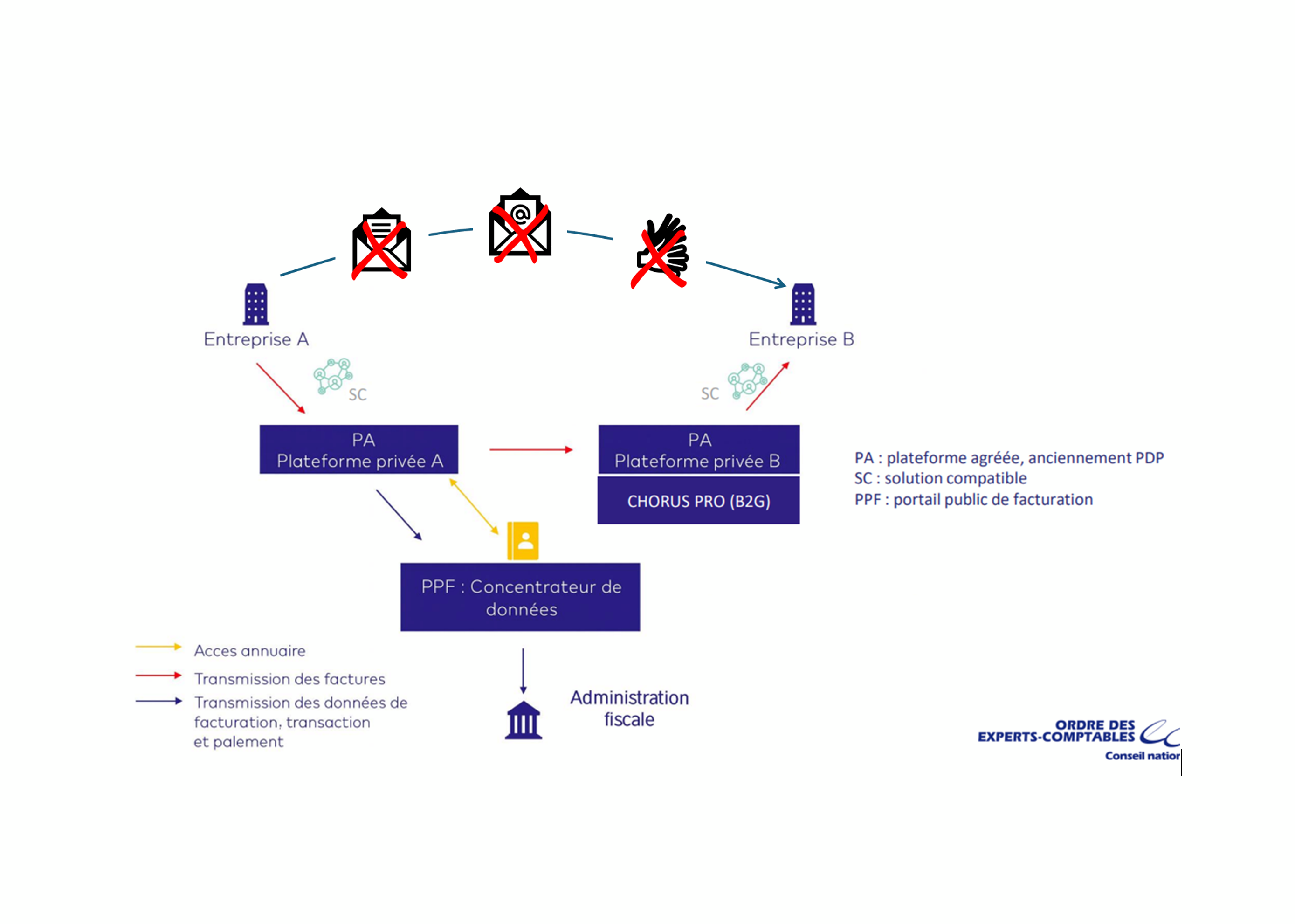 L’émission et la réception se font généralement via des plateformes ou des portails d’échange sécurisés, intégrant des mécanismes d’authentification, de signature électronique et d’horodatage, garantissant l’intégrité du contenu et l’identité des partenaires commerciaux. À partir du 1er septembre 2026, toutes les entreprises concernées, quelle que soit leur taille, devront être en mesure de recevoir la facture électronique au moyen d’une plateforme agréée (PA). Seules les Grandes Entreprises et les ETI seront obligées d’émettre des factures électroniques.