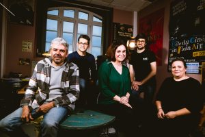 De g. à d. : Thierry Bordes, Rafael Maestro, Fanny Petit Van-Tornhout et une partie des douze membres de l’équipe de Ciné Passion ©Loïc Mazalrey
